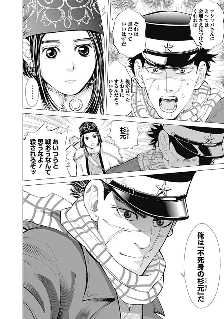 『不死身の杉元』日露戦争での鬼神の如き武功から、そう謳われた兵士は、ある目的の為に大金を欲し、かつてゴールドラッシュに沸いた北海道へ足を踏み入れる。そこにはアイヌが隠した莫大な埋蔵金への手掛かりが!? 立ち塞がる圧倒的な大自然と凶悪な死刑囚。そして、アイヌの少女、エゾ狼との出逢い。『黄金を巡る生存競争』開幕ッ!!!!